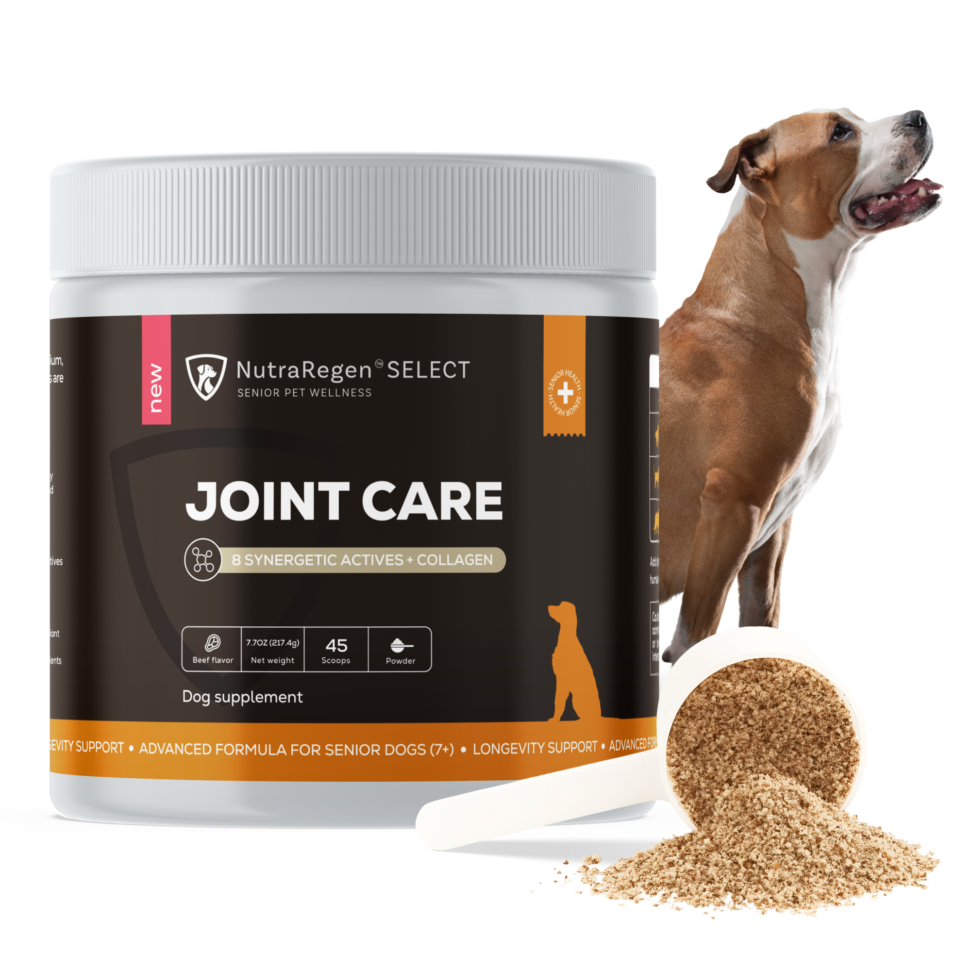 NutraRegen™ SELECT Joint Supplement for Senior Dogs is a premium daily formula designed to support mobility, flexibility, and joint health in dogs aged 7 and up. This advanced daily powder features 8 key actives — including Glucosamine HCl, Chondroitin Sulfate, MSM, and Collagen — to help maintain healthy joints, cartilage, and connective tissue.
